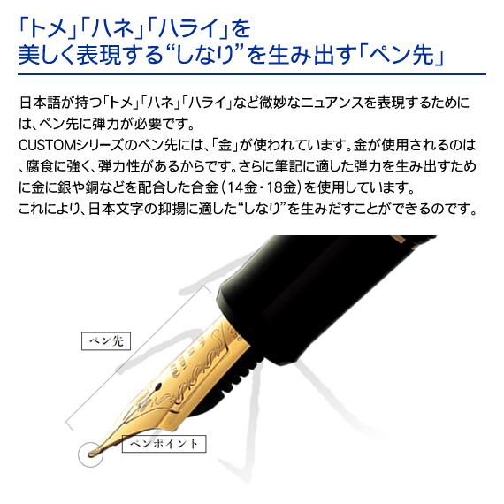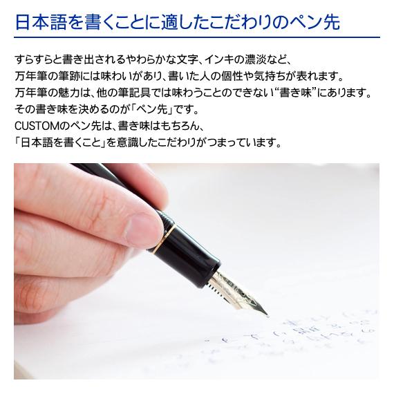 握りやすく太めな軸で、本格的な書き味を持った万年筆。メーカー通常価格:17,600円(税込)●商品名:カスタム74●種類:万年筆●ぺン先:14K 5号 (B・DR・DL・DG)●サイズ: 最大径φ 14.7mm 全長 143mm●名入れサイズ:W40mm×H4mm以内●印刷色:DICやPANTONEで選んでください。特色が使えますので、ほとんどの色で印刷できます。お手元に色見本がない場合、ご希望の色をお伝え頂ければご提案致します。●納期:校了後、2〜3週間(本体在庫がある場合)ご注文確認後、当店からご入稿先アドレスを連絡致します。(お急ぎでしたら→ info@dojima.net こちらまで)文字のみで宜しければカートに入れる前の「名入れ内容」欄にご記入下さい。↓原稿データを確認後、こういう感じになりますという見本(校正データ)をお送りします。↓お客様がそれを確認して頂き、問題なし(校了)になりましたら、そこから量産を開始し、出来上がり次第の出荷となります。