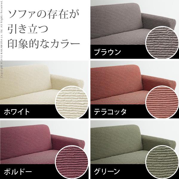 ※メーカー直送品のため、ご注文後の「お客様都合(色違い、サイズ違いなどの注文間違いなどを含む)」によるキャンセルは固くお断りいたします。ご注文の際は、カラー、サイズ、送料等をよくご確認ください。※複数同時購入の場合、個別に既定の送料がかかります。同時発送による送料割引などはございません。(オプション品や軽量物でも1個ごとに既定の送料が掛かります)※商品不良時などは出荷元メーカー手配により、交換対応をいたします。※メーカー直送のためはお受けできません。※沖縄・一部離島は別途送料がかかります。お見積もりいたしますのでお問い合わせ下さい。【カラーバリエーション】ブラウン・ホワイト・テラコッタ・ボルドー・グリーン【仕様】材質:綿60%、ポリエステル35%、ポリウレタン5%【サイズ】■適応ソファサイズ座面幅:約135〜190cm高さ:85cmまで奥行:85cm程度※奥行はソファの高さと座面幅のバランスによって異なります。株式会社ナカムラ(61001117)"}