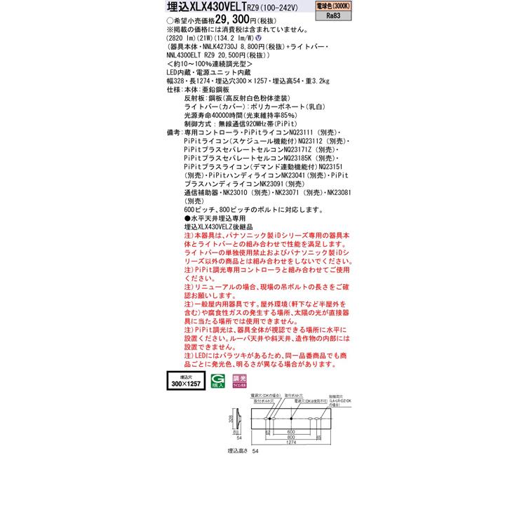 ●セット組合:【器具本体】NNLK42730J+【ライトバー】NNL4300ELT RZ9●LED内蔵、電源ユニット内蔵●LED(電球色)●色温度:3000K●光源寿命40000時間(光束維持率85%)●幅:328mm●長:1274mm●埋込穴幅:300mm●埋込穴長:1257mm●埋込高:54mm●質量:3.2kg●器具光束:2820lm●電圧:100-242V●消費電力:21W●消費効率:134.2 lm/W●【本体】亜鉛鋼板●【反射板】鋼板(高反射白色粉体塗装)●【ライトバー(カバー)】ポリカーボネート(乳白)●制御方式:無線通信920MHz帯(PiPit)●天井埋込型、PiPit(ピピッと)調光タイプ・一般タイプ・3200 lmタイプ・電球色●Ra83●商品型番・パナソニック(PANASONIC)・XLX430VELTRZ9商品画像はイメージです。品番でのご注文となりますので、仕様やお色味などは事前にメーカーへご確認下さい。●メーカー問合せ先 【0120-878-709】●安定器出力型:定格出力型●安定器補足:<約10-100%連続調光型>●600ピッチ、800ピッチのボルトに対応します。●水平天井埋込専用●(注)本器具は、パナソニック製iDシリーズ専用の器具本体とライトバーとの組み合わせで性能を満足します。ライトバーの単独使用禁止およびパナソニック製iDシリーズ以外の商品とは組み合わせをしないでください。●(注)PiPit調光専用コントローラと組み合わせてご使用ください。●(注)リニューアルの場合、現場の吊ボルトの長さをご確認お願いします。●(注)一般屋内用器具です。屋外環境(軒下など半屋外を含む)や腐食性ガスの発生する場所、太陽の光が直接器具に当たる場所では使用できません。●(注)PiPit調光は、器具全体が視認できる場所に水平に設置ください。ルーバ天井や斜天井、造作物の内部には設置できません。●(注)LEDにはバラツキがあるため、同一品番商品でも商品ごとに発光色、明るさが異なる場合があります。
