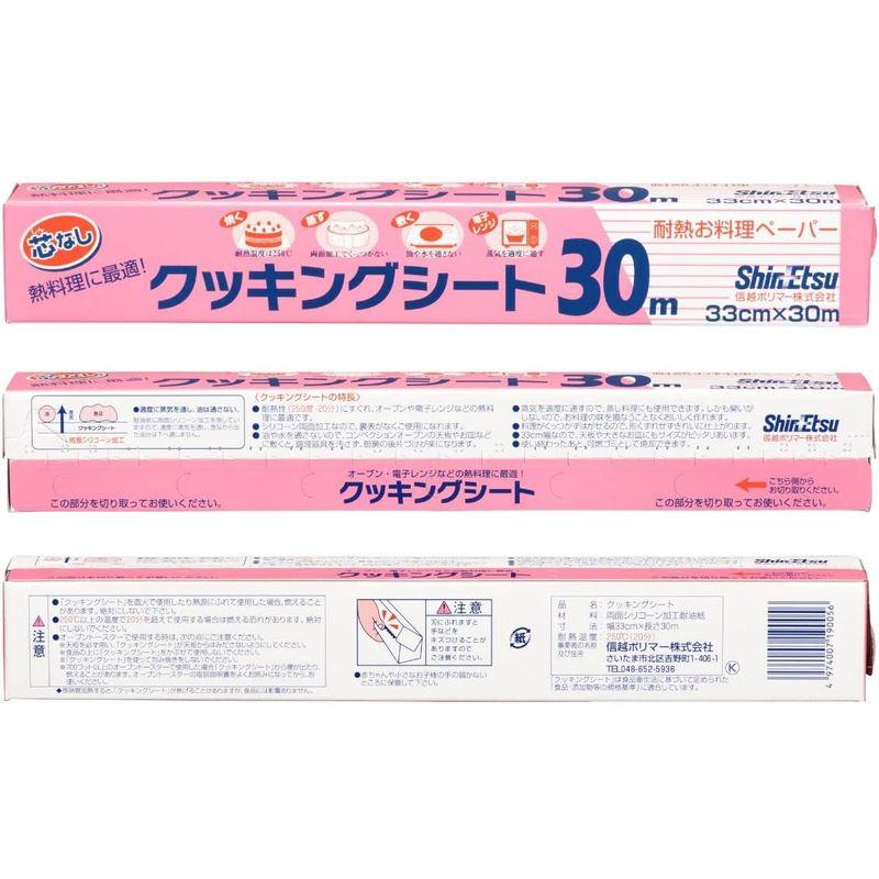 【商品名】 信越ポリマー クッキングシート 33cm×30m 業務用 電子レンジ対応 オーブン対応 20本入 ケース販売 【商品説明】 ・寸法:幅33cm×長さ30m(芯材なし)・対応:電子レンジ、オーブントースター、コンベクション・生産国:日本・素材:高密度耐油紙(両面シリコーン加工)・耐熱温度:250℃(20分)"} 寸法:幅33cm×長さ30m(芯材なし) 対応:電子レンジ、オーブントースター、コンベクション 生産国:日本 素材:高密度耐油紙(両面シリコーン加工) 耐熱温度:250℃(20分) ●両面シリコーン加工のクッキングシートです●耐熱性(250℃・20分)に優れ、オーブンや電子レンジなどの熱料理に最適です●両面シリコーン加工なので、コンベクションやオーブンの天板やお皿などに敷くと、調理器具を汚さず厨房の後片付けが楽になります●蒸気を適度に通すので、蒸し料理にも使用できます●臭いがしないので、料理の味を損なうことなく美味しく作れます●料理がくっつかず剥がせるので、型崩れせずきれいに仕上がります●使い終わったあと、可燃ゴミとして焼却できます●紙を密度を高めることによって油のしみ込みを防ぐ高密度耐油紙を使用しています【使用&保管上の注意】?パッケージのカット刃に触れますと、手などに傷をつけることがありますので、取り扱いにご注意ください?乳幼児の手の届かないところで保管してください?燃える恐れがありますので、直火で使用したり、熱源に触れてのご使用はおやめください?250℃以上の温度で20分を超えてご使用する場合は燃える恐れがありますので、絶対にしないでください?フライパンで調理する場合、250℃以上の温度になることがありますので、「ハイ、これ敷いて」をご使用にならないでください?<オーブントースターで使用する場合> ・天板を必ず用い、天板からはみ出さないようにしてください ・食品の上にかぶせて使用しないでください ・包み焼きをしないでください ・700ワット以上のオーブントースターで使用した場合、煙が出たり燃えることがあります。トースターの取扱説明書をよくお読みになってからご使用ください
