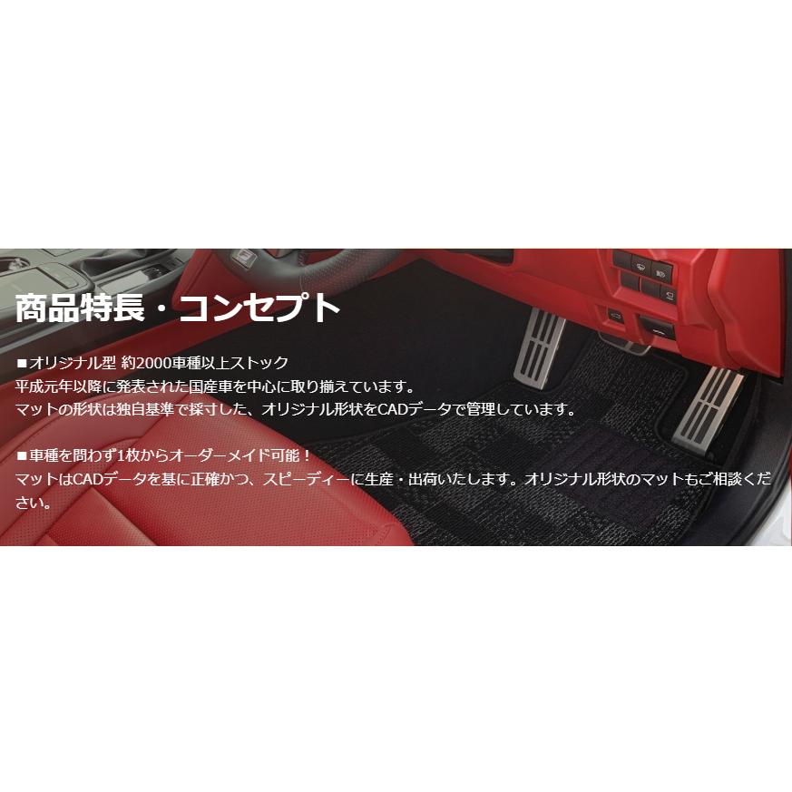 豊富なデザインでお車の足元を手軽にドレスアップ♪★お車1台分(足元すべての部分)がセットになっておりますお車への適合確認でご不明な点がありましたら、当店まで問い合わせ下さい。【マットの特徴】・車種ごとに採寸した車体にジャストフィットするオリジナル形状のマットです。・フロアマット1式セットになっています。・運転席側ヒールパッドは車種により有無があります。ご注文時に指定いただければパットの有無は対応致します。※すべて受注生産品になりますので、発送まで5〜7日程度お時間を頂きます。 発注後のキャンセル・交換は受け付けが出来ません。ご注意お願いします。"}