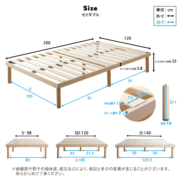 【キーワード】 脚付きすのこベッド 木製ベッド セミダブル ベッドフレームのみ SD 天然木 無垢 おすすめ フィトンチッド 森林浴 パイン材 ナチュラル 低ホルムアルデヒド 安い 激安 格安 インテリア 家具 人気 ランキング おしゃれ 通気性 シンプル セミダブルベッド【商品サイズ】120x200x33cm【商品重量】22.5kg【梱包サイズ】122x25x20cm【梱包重量】23.5kg