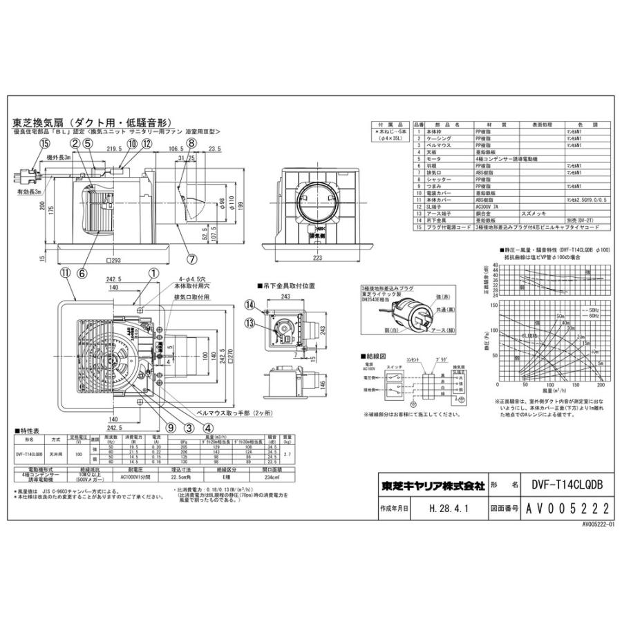 【DVF-T14CLQDB】 《KJK》 東芝 ダクト用換気扇 低騒音型 3極接地形差込みプラグ電源コード付 1室 III 14 プラ 強弱付 大風量 ωβ0