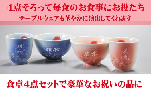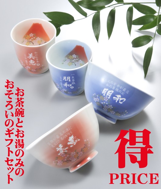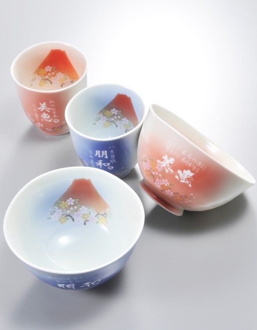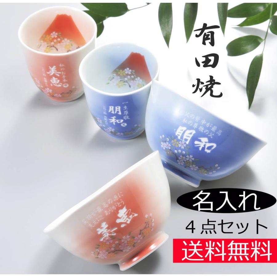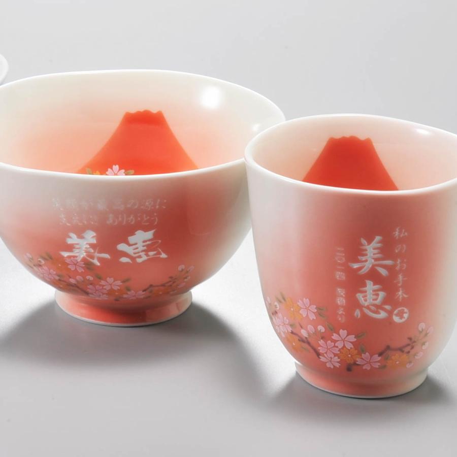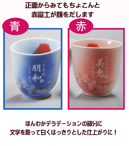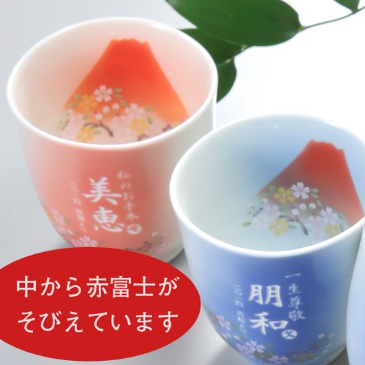 赤富士と桜の絶妙なコンビネーションが 日本の象徴として上品な仕上がりです。季節関係なく好まれる 富士と桜のデザインは当店人気のシリーズとなっております口元部分がランダムなラインがとてもかわいらしく薄手ながらにしっかりとした素材感です。商品名:有田焼 赤富士 白生地 湯飲み 夫婦茶碗 豪華お食事4点セット■産地:有田 2点(赤・青)■湯のみ■サイズ:口径72mmxH73mm■木箱■文字加工:3行程度(サンプルに文字数をあわせると綺麗な仕上がりに)