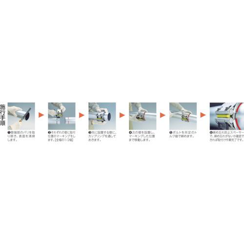 [特長]●メタルタッチ構造でトルクレンチ不要となり、施工管理がさらに簡単になりました。[仕様]●呼び径A:100●呼び径B:4●ケーシング幅(mm):96.0●ゴムリップ間隔(mm):41●締付けボルト六角穴サイズ(mm):8●適合管外径(mm):114.3●適合流体:水、温水、空気、薬品●適合配管:配管用炭素鋼鋼管/VLP/PLP/ステンレス鋼管●流体温度:-30〜90℃(蒸気では使用)●使用圧力:水、薬品/1.6MPa 空気/1.0MPa 給湯/80℃以下の場合1.6MPa、80〜90℃の場合は1.0MPa●日本水道協会認証品[材質/仕上]●ケーシング/ボルト:ステンレス(SUS304)●ゴム:エチレンプロピレンゴム(EPDM)