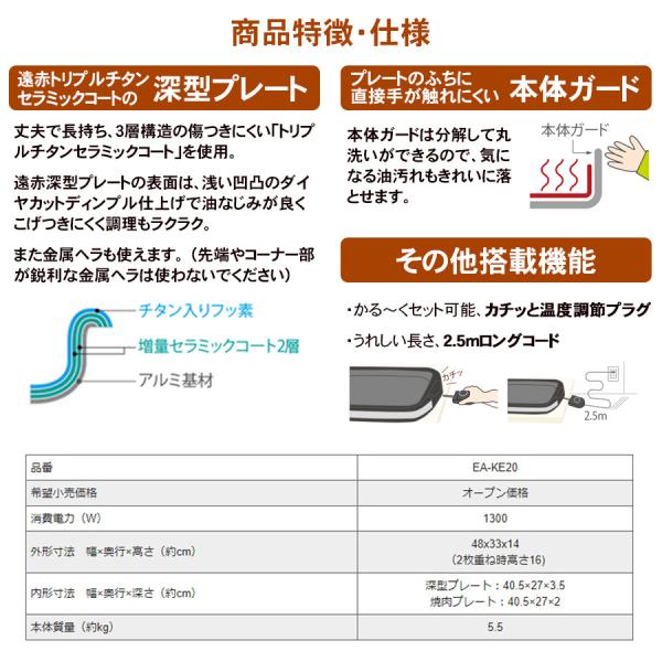 | 【外形寸法】 ●幅 48.0cm×奥行 33.0cm×高さ 14.0cm 【プレート寸法】 ●深型:幅 40.5cm×奥行 27.0cm×高さ 3.5cm ●焼肉:幅 40.5cm×奥行 27.0cm×高さ 2.0cm 【重量】 ●約5.5kg 【消費電力】 ●1300W 【電源コード長さ】 ●約2.5m 【カラー】 ●ブラック (JAN:4974305218940) 【特徴・機能】 ●『深型プレート』・『傾斜溝つき焼肉プレート』の2枚プレート ●「焼く」から「煮る」まで対応できる深さ3.5cmの『深型プレート』 ●プレートの溝が傾斜していて落ちた脂が流れやすい『傾斜溝つき焼肉プレート』 ●丈夫で長持ち、耐久性が高い『遠赤トリプルチタンセラミックコートの深型プレート』 ●かる〜くセットできる『カチッと温度調節プラグ』 ●プレートのふちに直接手が触れにくい『本体ガード』 ●2.5mロングコード |