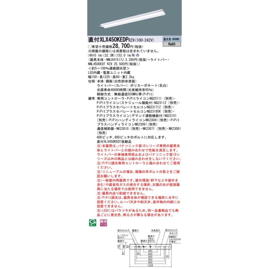 【法人様限定】パナソニック XLX450KEDP RZ9 LEDベースライト 40形 反射笠付型 5200 lm PiPit調光 昼光色【NNLK41517J + NNL4500EDT RZ9】