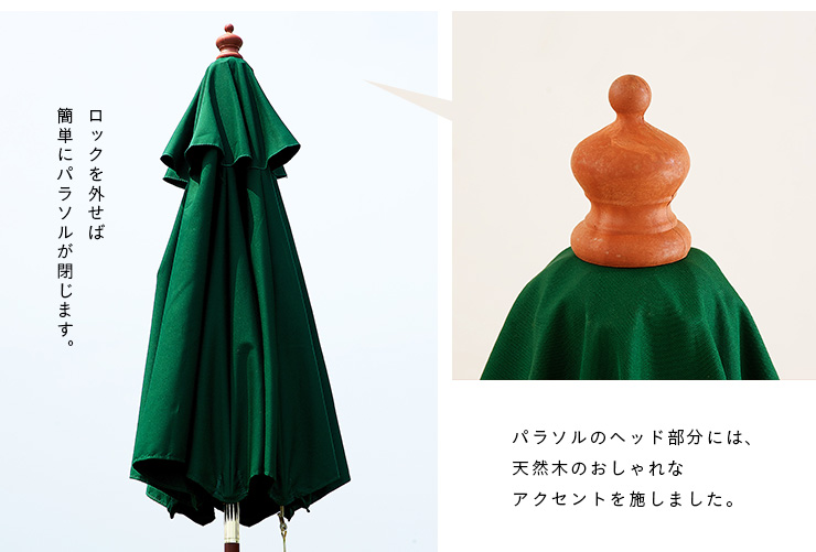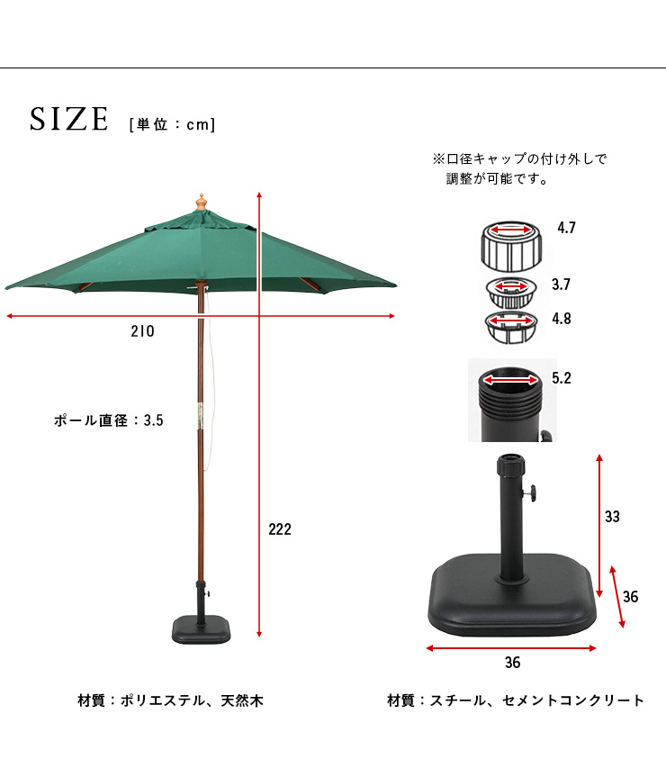 ※こちらの商品はお客様組立てとなります。■サイズパラソル:W210 × D210 × H222cm(ポール直径:3.5cm)ベース:W36 × D36 × H33cm■材質パラソル:ポリエステル/天然木ベース:スチール/セメントコンクリート■カラーグリーン・ベージュ(アイボリー)・ネイビー・エンジ・ブラウン■生産国中国■送料関東〜九州:送料無料東北:980円北海道:1480円沖縄・離島:別途お見積り◯大型商品となります。搬入経路の確認をお願いいたします。※お部屋に搬入できないなどの理由でのキャンセルはお受けしておりません。※商品出荷後のキャンセルはできかねます。ご了承ください。※お届けまで、出荷から7-10日ほどお時間をいただいており、配送に曜日制限がある場合もございます。(地域や時期によりましては2週間以上かかる場合がございます。)※時間指定は出来かねます。