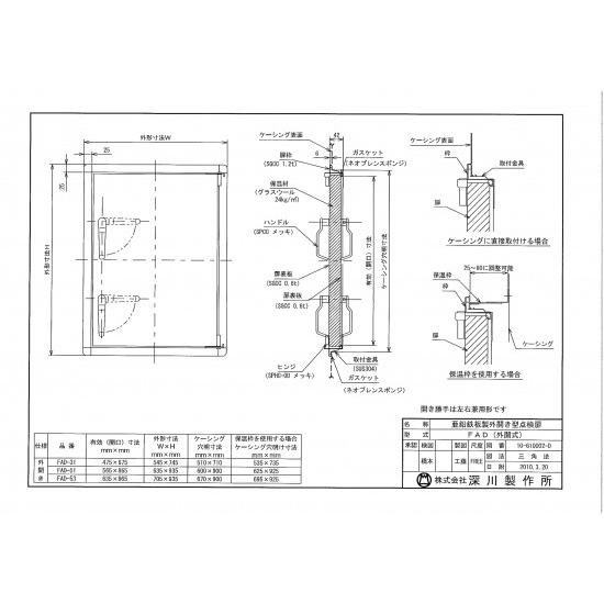 亜鉛鉄板製点検口仕様:外開型取り付け開口寸法:510×710有効寸法:475×675外形寸法:545×745開き勝手は左右兼用形です。金具の変更したことによって強度を増し歪みを低減。従来よりも25%強度を向上。FAD-7からFAD-30はハンドル1カ所FAD-31以降はハンドル2カ所"}