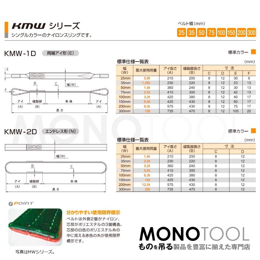 日本製のナイロンスリング 丸善織物のKMWシリーズ(1色) 両端アイ形(E型)幅150mm×2mです。適度な伸びが吊り上げた時の衝撃を和らげる耐摩耗性に優れたナイロン素材のベルトスリングです。ベルトは外側2層がナイロン、芯部がポリエステルの3層構造。スタンダードなシングルカラー(1色)仕様。"}