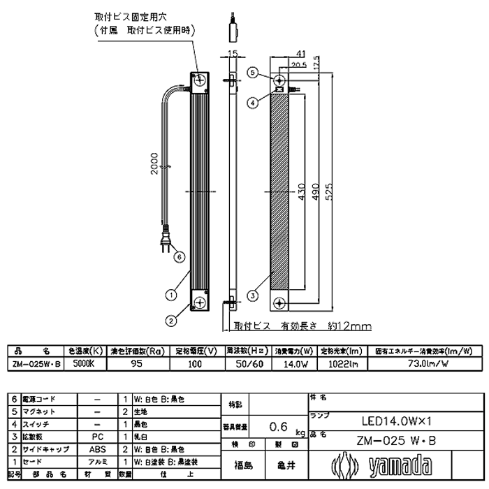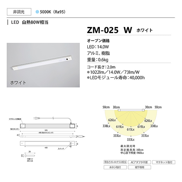 ●メーカー:山田照明●品番:ZM-025W●JANコード:4968478104520●光色(LED):昼白色●色温度(K):5000K●演色性(Ra):Ra95●LEDタイプ:LED一体型●従来光源相当:白熱80W相当●調光:非調光●光源仕様:LED14.0W●寸法:幅525×41mm・厚15mm●重量:0.6kg●材質仕上:アルミ/樹脂●定格光束(LED):1022lm●消費電力(LED):14W●固有エネルギー消費効率(LED):73lm/W●LEDモジュール寿命:40000時間スチール製のデスクトップにマグネットで簡単設置。机上面を最大限に使える革新的なZ-LIGHT(ゼットライト)。厚さ15mmの薄型タイプ。設置部が木製でも木ネジで取り付けできます。ACアダプタ不要。