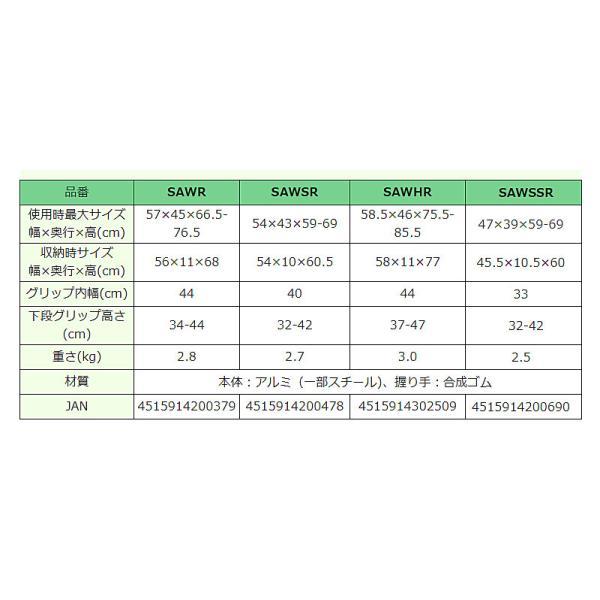 ●サイズ/ 幅53〜54×奥行41〜43×高さ59〜69(5段階/2.5cm)cm 折りたたみ時:幅54×奥行10×高さ60.5cm ハンドル内幅:40cm 下段グリップ高:32〜42cm●重さ/2.7kg●材質/フレーム:アルミ(一部スチール)●最大使用者体重/100kg●標準機能/折りたたみ●メーカー品番/SAWSR●JANコード/4515914200478●メーカー名/イーストアイ・小柄な方向き