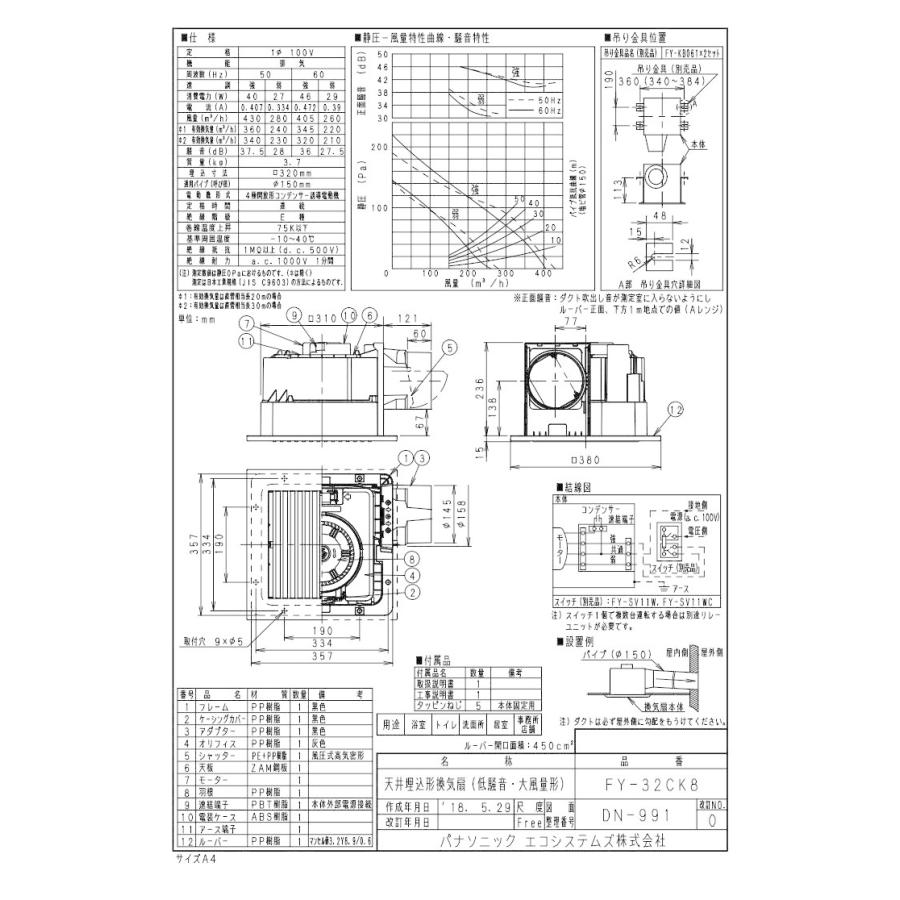 換気扇 パナソニック ダクト用換気扇 FY-32CK8 検索用カテゴリ255 【埋込320角】【パイプ150】【低騒音】【大風量】FY-32CK8 Panasonic 天井埋込形換気扇 ルーバーセットタイプ 大風量形 強・弱速調付 浴室、トイレ・洗面所、居室・廊下・ホール・事務所・店舗用 低騒音形 400立方m/hタイプ