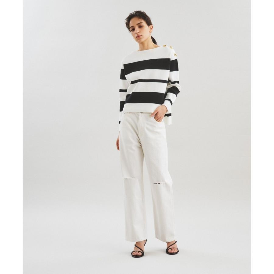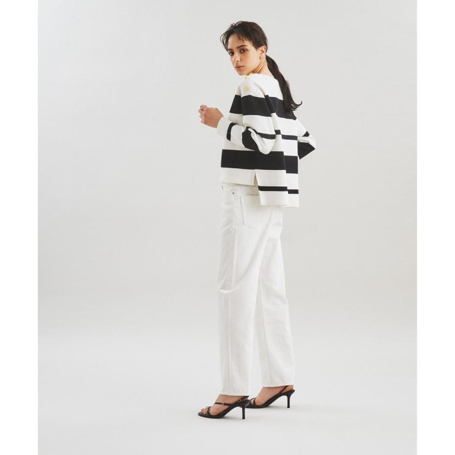 コットンブレンドの糸をハイゲージで編み立てた、春にぴったりなニットトップス。ドロップショルダーにサイドスリット入りのゆったりとした身幅で抜け感をプラスして、デイリーカジュアルにスマートに溶け込むトレンドライクな一枚に仕上げました。ピッチが異なるボーダー柄が、いつもとはまた違ったモードな着こなしを叶えてくれる鍵。ワイドパンツやロングスカートなど、全体的にゆったりとしたエフォートレスな着こなしも様になる一品です。
