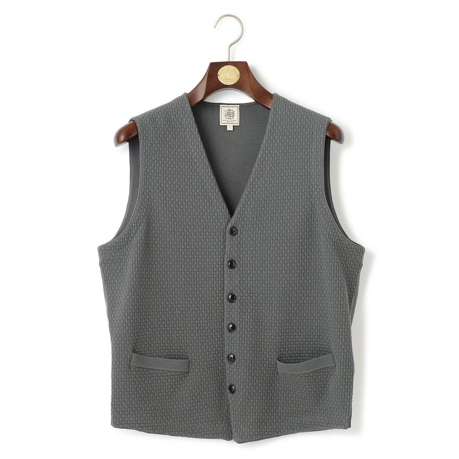 スタイリングのアクセントに■素材綿ポリエステルの強捻素材ですので、素材がさらっと清涼感があり、春夏シーズンに適した素材感となっています。またリンクス編みという表目と裏目を使って編みこむ手法を使って編地の凹凸感を表現しています。後身頃はフラットな組織で編立ています。■シルエットレギュラーフィット■仕様前身頃に凹凸感のある編地で表情を付け、後身頃はジャッケットインを想定した、フラットでボリュームを抑える編地を仕様しています。■スタイリングジャケットイン推奨アイテムです。■デザイナーコメントシンプルになりがちな春夏のスタイリングのアクセントとしてご活用下さい。布帛程のかっちり感が無く、ニットならではのリラックスした着用感のベストです。