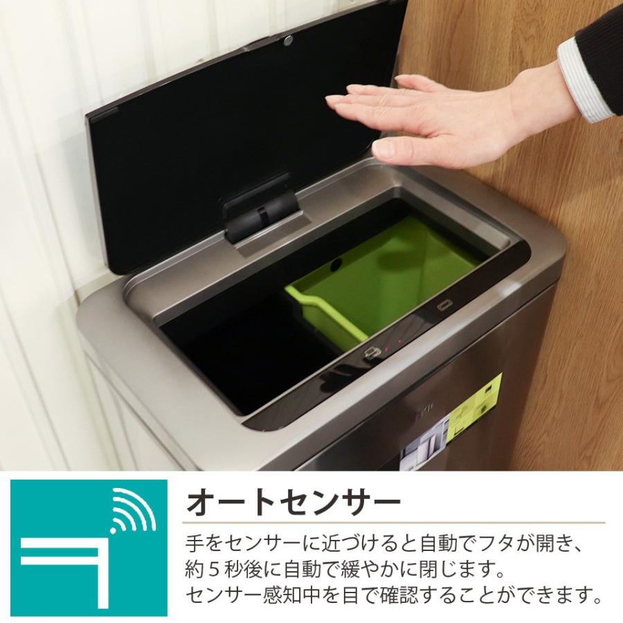 【サイズ】幅46×奥行27×高さ64.7cm【素材】表面材:ステンレス【梱包サイズ】31×51×72cm(1個口)【備考】・単3乾電池×6本は別売となります。※アルカリ電池をご使用ください。・脱臭剤(脱臭フィルター)は付属しておりません。市販のものをお使いください・開閉部の上に棚など障害物がある状態で使用すると、センサーが反応し開いたままの状態になります。開閉部の上部は25cmほどのスペースが必要です。本体前方の黒い部分にセンサーがある為、本体を棚から約10cmほど前に出してお使い頂く場合センサーは反応いたしません。【配送について】商品の配送は玄関までとなります※配達員1名でお届け致しますので、お客様にお手伝いをお願いする場合がございます。