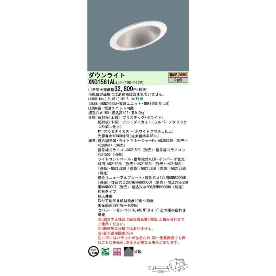 XND1561ALLJ9 パナソニック 傾斜天井用LEDダウンライト φ150 調光 電球色