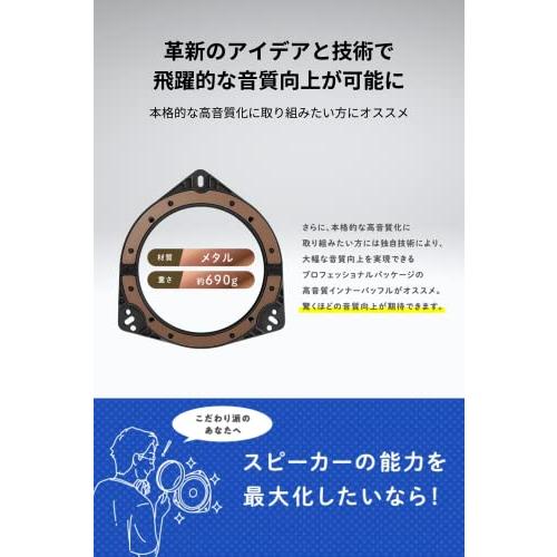 【商品概要】革新のアイデアと技術で飛躍的な音質向上が可能にスバル車用 17cmスピーカーの持つ本来の能力を最大限に引き出すプロフェッショナルパッケージ「6シリーズ」革新的な技術と発想によりスピーカー本来の性能を最大限に引き出す誰でも簡単、取付けるパーツは2つだけ【商品説明】革新のアイデアと技術で飛躍的な音質向上が可能にスピーカーの持つ本来の能力を最大限に引き出すプロフェッショナルパッケージ「6シリーズ」誰でも簡単に取付可能。たった2つのアイテムでスピーカー能力を最大化し、音質を劇的に向上させる高音質インナーバッフルのプロフェッショナルパッケージは、「ハイブリッド メタルダイキャスト インナーバッフル」と、「ウェーブ形状遮音クッション」がセットになった音質向上を手軽に実現するパッケージです。たった2つのアイテムで、ドア鉄板部の強度を上げ、取付部付近の共振を抑えると共に、スピーカー背面からの逆相音の干渉を減少。クリアで量感のある音に改善し、車室内の音質を劇的に向上させます。革新的な技術と発想によりスピーカー本来の性能を最大限に引き出す「ハ【当店からの連絡】"} 革新のアイデアと技術で飛躍的な音質向上が可能に
