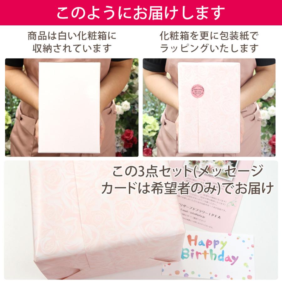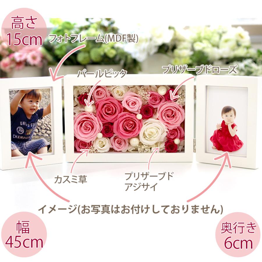| | サイズ | 両側を閉じた状態で 縦15cm横22cm幅8cm 開いた状態で 縦15cm横45cm幅8cm | | 素材 | プリザーブドローズ、プリザーブドアジサイ、プリザーブドカスミ草、アートワイヤープランツ、パールピック、フォトフレーム(MDM製/表面にガラスカバー) ★包装紙でギフトラッピングを行い、ギフトボックスに梱包いたします | | 注意事項 | 写真付きではございませんのでお好みのお写真を入れてお楽しみください。 | | 同梱品 | プリザーブドフラワーの取扱説明書 メッセージカード(希望者のみ) ※ギフト仕様でお送りするため、納品書、明細書、領収書、広告物は一切同封いたしませんのでご安心ください。 | |