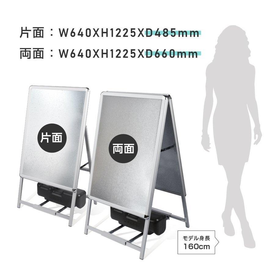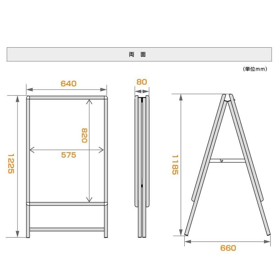 お手軽なA型看板、飲食店にオススメです。 四方開閉式で中身のポスター交換が簡単、 いろいろな内容を切り替えます! (一例:昼はランチ、夜は晩酌セットで交替して使えます。) 様々のサイズが取り揃えてます、お気軽にお問い合せ下さい。看板表示面製作のおすすめ商品です!※展示用ポスターはラミネート加工することがおすすめです。本体カラー:ブラック本体サイズ(mm):W640×H1225×D615原稿サイズ(mm):W594×H841表示画面サイズ(mm):W575×H820重量(kg):8.75材質:本体:アルミ / 面板:アルミ複合板取付方法:ポスター入れ替え"}