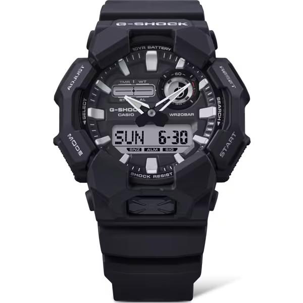 ワイドフェイスとビッグケースで、10年バッテリーを搭載したデジタルモデルのGD-010とデジタルアナログコンビモデルのGA-010は、ワールドタイム、ストップウオッチといった基本機能をはじめ、大型フロントボタンで操作しやすいスーパーイルミネーターにより暗闇での視認性も確保します。バイオマスプラスチックやロングライフバッテリーにより、環境にも配慮したモデルです。ケース素材に、軽量ながら樹脂の概念を超える高剛性を発揮するカーボンファイバー強化樹脂入りファインレジンを使用。衝撃による破損、変形を防ぐことで、内部に配置したモジュールを保護します。各モデルともベースカラーのブラックに加えて、ワークスタイルにも合わせやすいカーキ、オレンジ、ブルーグリーン、ベージュといったカラーを展開。センターケース・ベゼル・バンドにバイオマスプラスチックを使用。カジュアルスタイルからワークスタイルまでアクセントになるクールなデザインです。●バンド:樹脂バンド