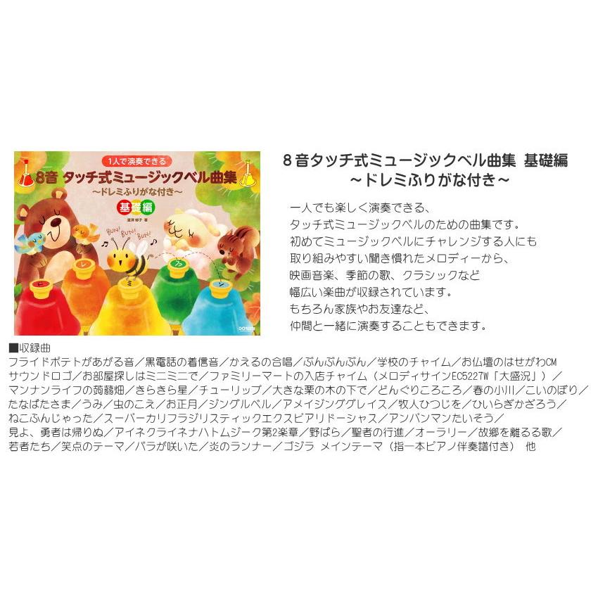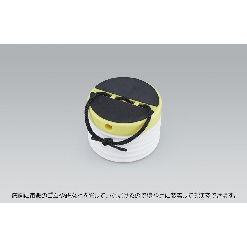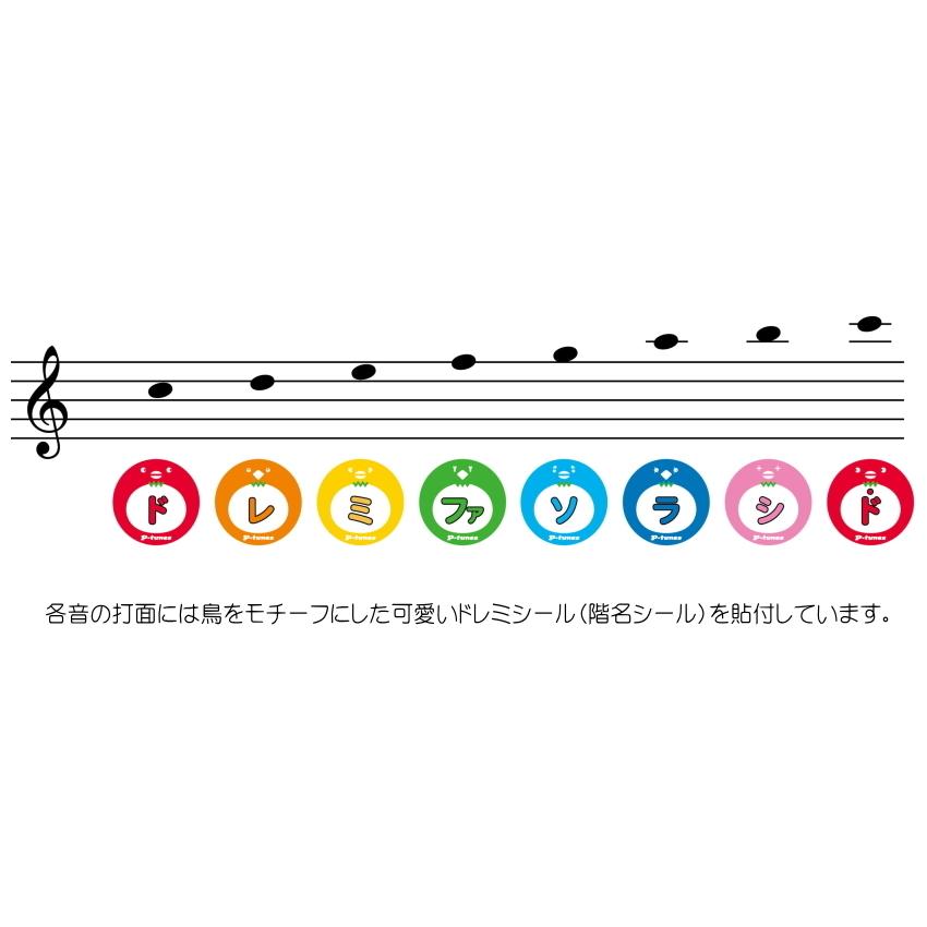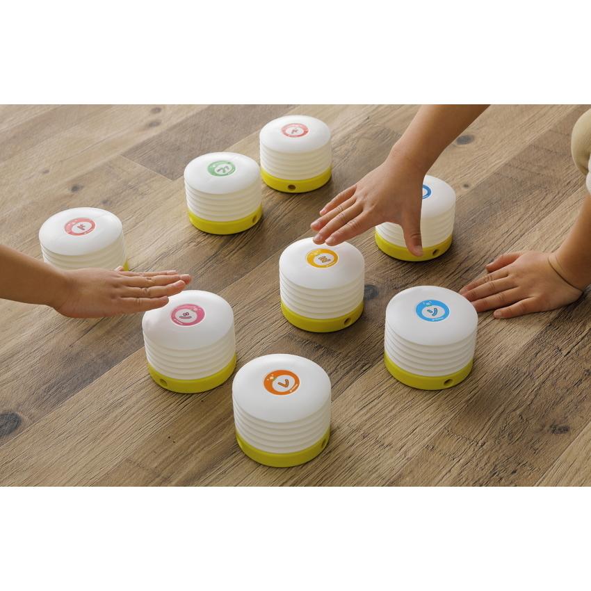 | 手で押さえるとポンプ内部の空気が押し出されリードが鳴る楽器で、1オクターブ8音のセットです。 机などに置き、楽器の打面中央部を押さえたり叩いたりして演奏します。 ゆっくり押すと長い音、素早く押すと短い音、強く押すと大きな音、弱く押すと小さな音が表現できます。 底面に市販のゴムや紐などを通していただけるので腕や足に装着しても演奏できます。 各音の打面には鳥をモチーフにした可愛いドレミシール(階名シール)を貼付しています。 音別に色分けしているので、音を視覚で認識でき、小さなお子様から演奏を楽しんでいただけます。 また、このシール部(打面中央部)を押さえると良い音で演奏できる目印にもなっています。 本商品は、保管や持ち運び時に最適なソフトケースおよび曲集付きセットです。 | ||||||||