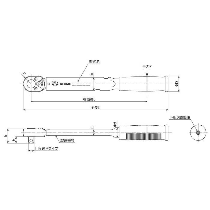 | 仕様: | ・トルク調整範囲(N・m):30〜140 ・適用ねじ(参考)/普通鋼:M16 ・適用ねじ(参考)/ハイテン:M12 ・最大トルク時の手力P(N):444 ・有効長L(mm):315 ・全長L"(mm):380 ・角ドライブa(mm):12.7 ・角ドライブb(mm):14 ・頭部R(mm):18.8 ・頭部h(mm):33.5 ・本体m(mm):28 ・本体n(mm):12.2 ・本体d(mm):21.7 ・本体D(mm):34 ・グリップ:樹脂 ・調整工具:No.930 ・精度:±3% |
